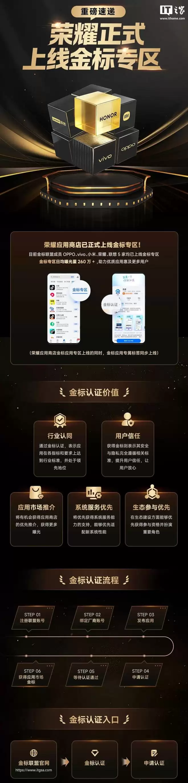 IT之家 1 月 14 日消息,移动智能终端生态联盟今日宣布,荣耀手机应用商店正式上线金标专区。目前金标联盟成员 OPPO、vivo、小米、荣耀、联想 5 家均已上线金标专区,专区日均曝光量超 26
