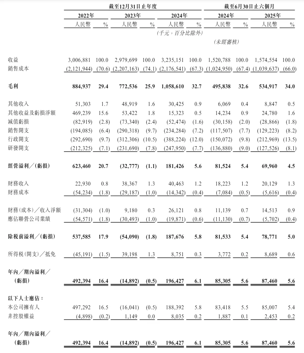 财务数据显示,汉得信息近三年营收呈现波动上升态势。2022年至2024年分别实现营业收入30亿元、29.8亿元和32.35亿元,其中2024年营收同比增长8.56%。同期毛利润分别为8.85亿元、7.7亿元和10.59亿元,对应毛利率从29.4%降至25.9%后回升至32.7%。经营利润方面,公司经历2023年3278万元亏损后,2024年实现1.81亿元盈利,经营利润率相应从-1.1%恢复至5.4%。期内利润表现与经营利润趋势一致,2024年录得1.96亿元净利润,期内利润率达6.1%。