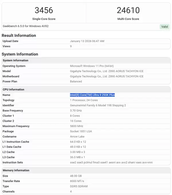 根据Geekbench流出的信息,尚未发布的酷睿Ultra 200K Plus系列中两款型号——桌面版的酷睿Ultra 9 290K Plus与移动版的酷睿Ultra 9 290HX Plus先后出现在数据库中。