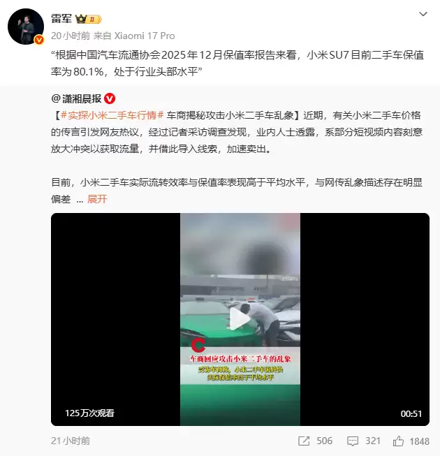 面对市场传闻,小米方面迅速作出回应。1月13日,小米科技创始人雷军通过微博辟谣“小米二手车无人问津”的说法,强调相关报道与事实不符。小米公关团队同步转发行业分析文章,呼吁公众理性看待市场波动。值得注意的是,中国汽车流通协会的报告显示,尽管短期价格承压,但小米SU7的保值率仍优于多数同级竞品,其市场认可度并未因短期波动出现根本性动摇。