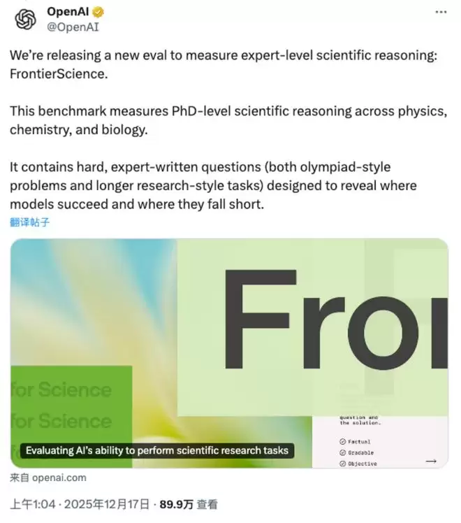 值得一提的是,同一时间窗里,OpenAI也发布了对于AI在科学发现领域能力评测的论文《FrontierScience: Evaluating Al's Ability to Perform Scientific Research Tasks》概述,指出现有评测标准在AI for Science领域失灵。
