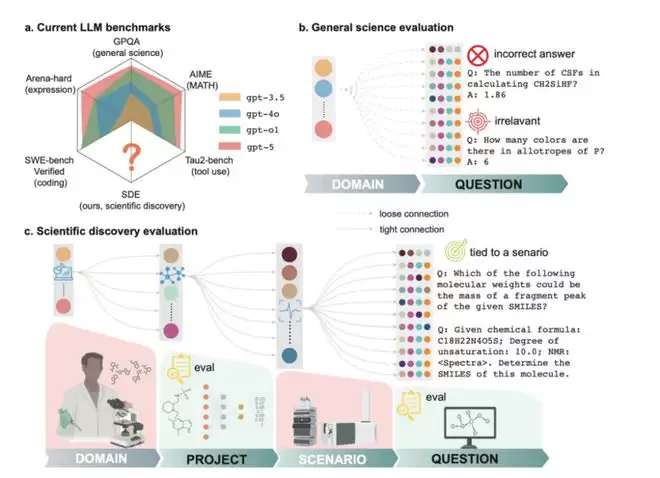 论文推出了LLMs for Science首套评测体系SDE(Scientific Discovery Evaluation),从科学问题到研究项目,对GPT-5、Claude-4.5、DeepSeek-R1、Grok-4等全球主流大语言模型在生物、化学、材料、物理领域的科学研究与发现能力完成摸底。