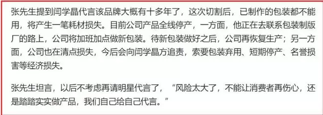 他坦率地道出了做出如此极端决策的原因:公司仓库里堆积如山的成品包装袋上,全都清晰地印着闫学晶那张微笑的代言人形象。