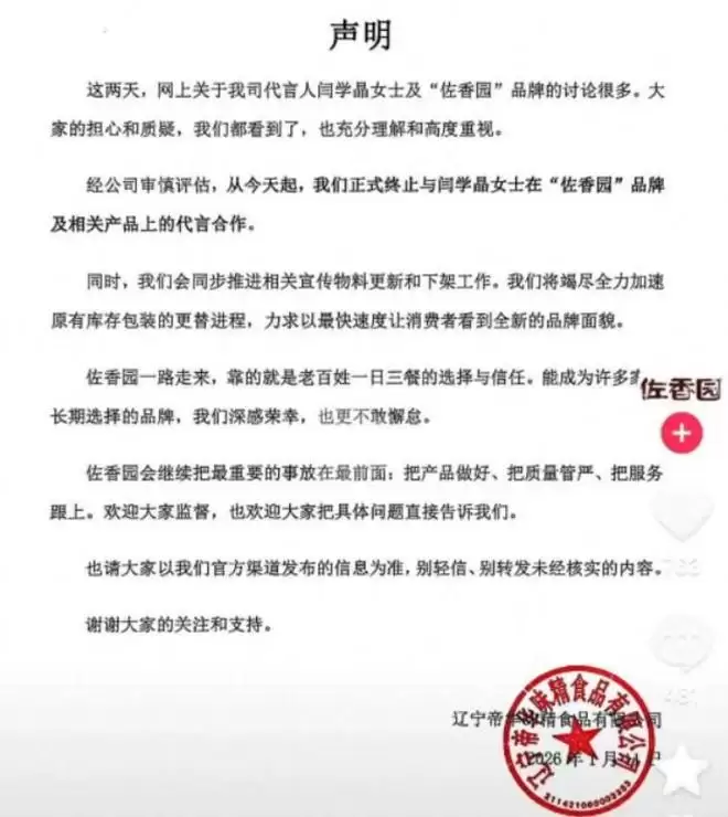 首先做出反应的是调味品品牌“佐香园”,其最新账号在重重压力之下于1月11日正式发布声明,宣布终止与闫学晶的合作。