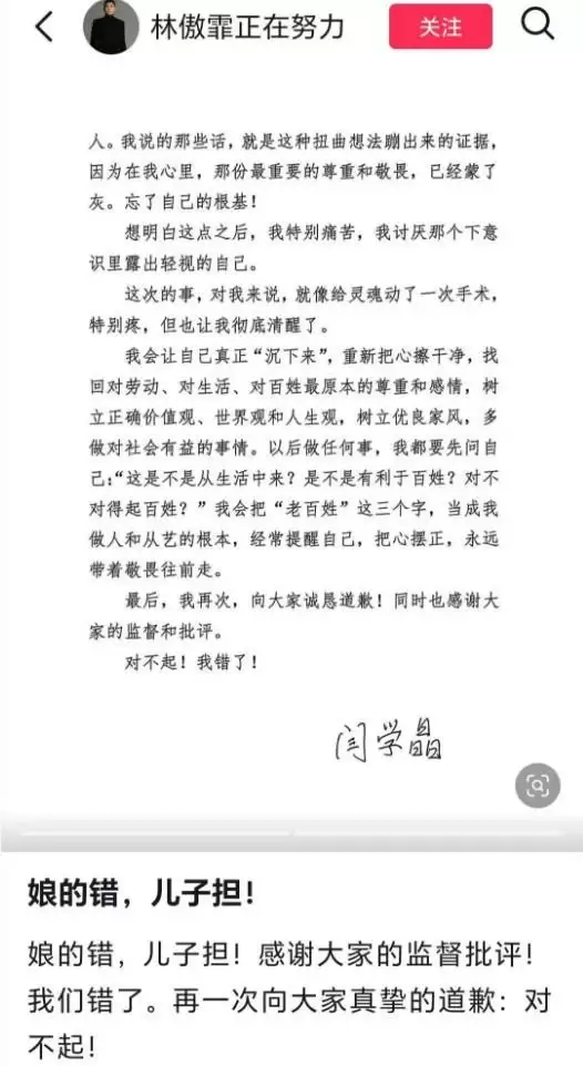 紧接着在1月12日,她的儿子林傲霏也在社交媒体账号转发了这封道歉声明,并配上文案:娘的错,儿子担!