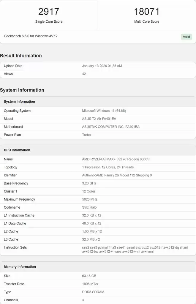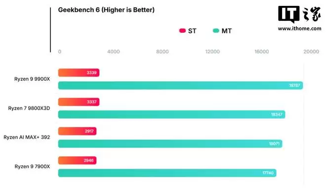 Geekbench 6的测试数据直观展示了这款移动端SoC的强悍实力,Ryzen AI MAX+ 392取得了单核2917分、多核18071分的优异成绩。