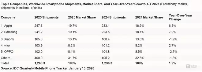 根据IDC最新发布的《全球季度手机跟踪报告》初步数据显示,2025全年,全球智能手机出货量达到12.6亿部,实现了1.9%的同比增长。中国智能手机市场出货量约2.85亿台,同比下降0.6%。