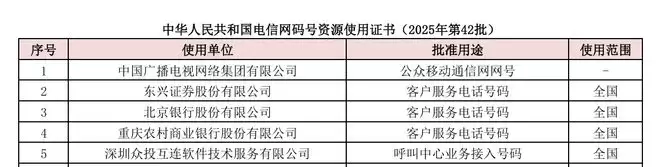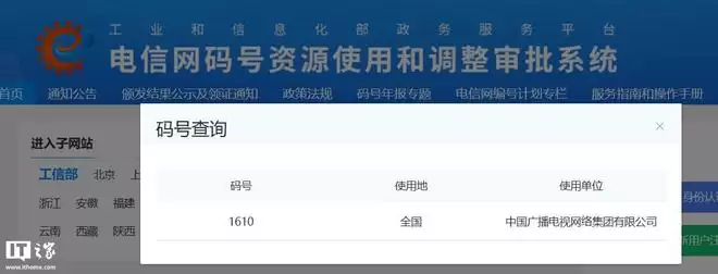 IT之家 1 月 15 日消息,工业和信息化部 1 月 7 日公布了 2025 年第 42 批次电信网码号资源。其中,中国广播电视网络集团有限公司新增了 1610 码号,信息显示:批准用途为“公众移