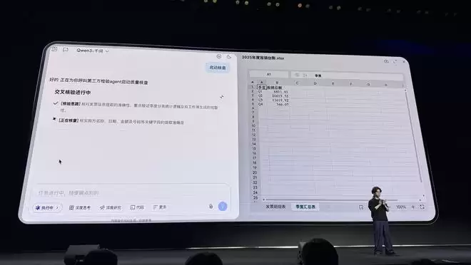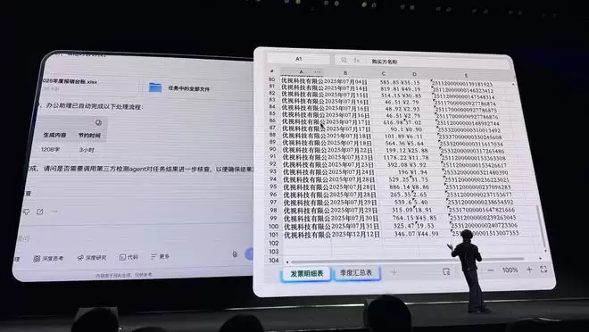 千问App支持调用Office办公工具帮用户完成工作任务。比如当用户上传一批发票让千问App基于此做表格,从现场演示结果来看,其将101张发票全部录入。