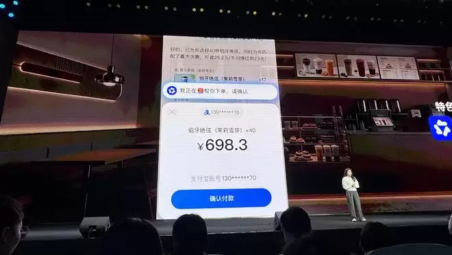 在发布会上,吴嘉现场演示了用千问App点“第一杯奶茶”。他给千问App下达一句话指令:“帮我点40杯霸王茶姬的伯牙绝弦”,千问App迅速调用淘宝闪购下单,无需任何跳转即在端内完成AI支付。不久后,淘宝闪购骑手就将奶茶送达现场。