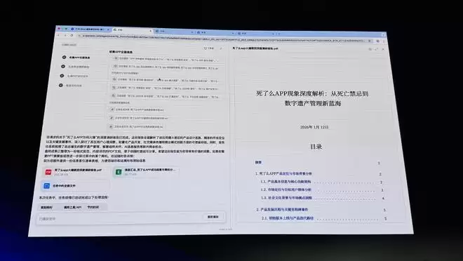当现场演示员向千问了解近期的现象级应用“死了么”的情况,千问累计进行了80多次搜索,仅花了8分钟就反馈了24页深度报告,通过文字和表格多种形式将相关信息总结给用户。