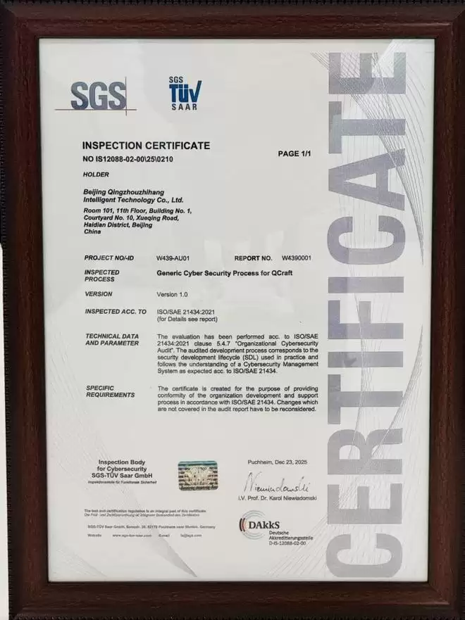 在本次认证过程中,轻舟智航团队与SGS专家团队紧密协作,从概念阶段开始,到系统开发、软件开发、硬件开发和后开发阶段的全部网络安全活动,以及全生命周期的网络安全管理,全面依照标准要求,并结合自身开发流程和质量体系,累计完成百余份网络安全相关技术文档,顺利获得SGS德国认证中心的认证通过。