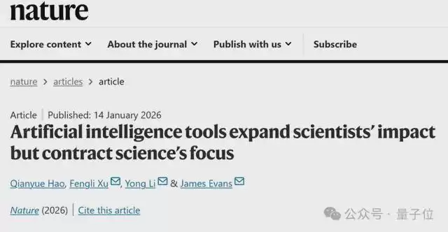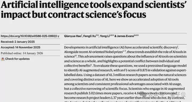于是,团队向着这一问题出发了,并最终发表了《Artificial Intelligence Tools Expand Scientists’ Impact but Contract Science’s Focus》这篇论文。