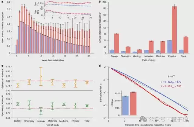 基于该数据集,团队系统性分析了AI在自然科学六大领域(生物、医学、化学、物理、材料科学和地质学)的影响。