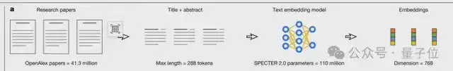 具体到第一步,他们把每篇论文中最能代表其内容的标题和摘要作为核心文本,通过一个深度嵌入表征模型转换成一个由768个数字组成的、固定长度的数学向量。