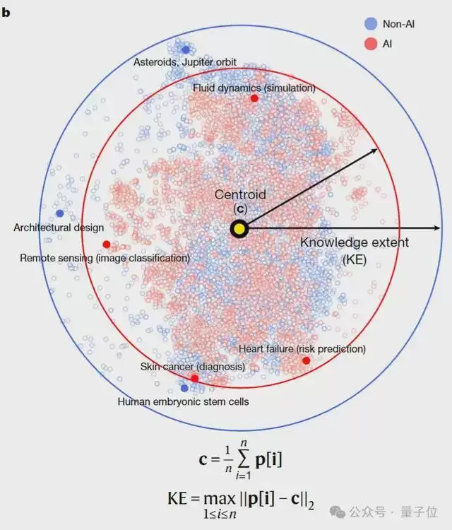 比如对于某个领域一年的AI论文,先计算它们所有坐标点的几何中心,然后找出离中心点最远的那篇论文,测量它们之间的欧氏距离。