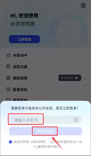 在“必访”应用中寻找资源,首先需要在个人信息保护指引的弹窗里,点击确认“已阅读并同意”,即可进入应用主界面。若您打算发布内容,请在登录窗口填写手机号码和验证码,完成验证步骤。