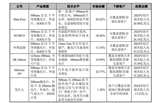 上海超硅表示,公司是全球极少数集晶体生长设备、软件系统与工艺技术于一体的企业之一。公司代表性产品的关键技术指标已与全球前五大厂商处于同一水平,整体技术水平处于国内领先、国际一流水平,不过在良率、技术节点覆盖上仍存在一定差距。公司亦具备优质的客户资源,已覆盖全球前20大集成电路企业中的18家,与前五大厂商不存在明显差距。