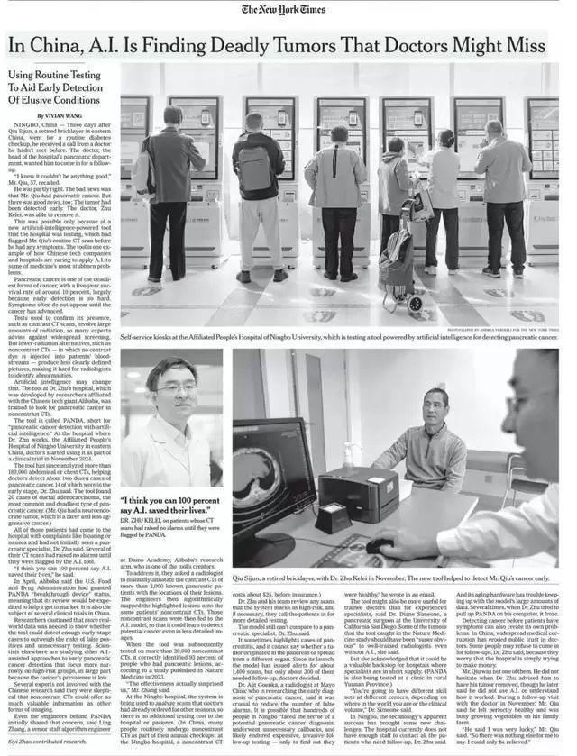 最近,《纽约时报》有一篇报道挺火,讲的是宁波的一位普通退休泥瓦匠邱先生,去医院做常规糖尿病检查,结果AI从他的平扫CT片里发现了胰腺癌,幸好发现得早,邱先生很快做了手术切除。要知道,胰腺癌是最凶险的癌症之一,五年生存率仅约10%,很大程度上是因为早期发现极其困难。而报道里这款中国AI,识别准确率能到93%左右,筛查一次25美元。现在这项AI技术已经在浙江、上海的多家医院用起来了。光是宁波那家医院,就已经用它分析了超过18万张CT片,帮医生发现了24例胰腺癌,其中14例都是早期。
