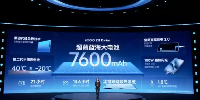 iQOO Z11 Turbo内置7600mAh超薄蓝海大电池,采用行业领先的第四代硅负极技术,电池能量密度达到iQOO全系最高水准。同时,该电池应用第二代半固态电池技术,具备出色的环境适应能力,在40摄氏度的炎热环境或零下20摄氏度的低温场景中,均可保持稳定的电池活性与放电效率。