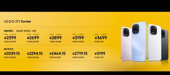 iQOO Z11 Turbo 提供5个存储版本,12GB+256GB首销价2399元,16GB+256GB首销价2699元,12GB+512GB首销价2899元,16GB+512GB首销价3199元,16GB+1TB首销价3699元,在发售时可直接叠加国补。