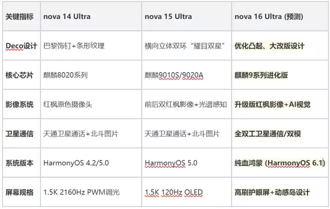 为了更直观地看清nova系列的进化路径,我们将nova 14 Ultra、nova 15 Ultra与预测中的nova 16 Ultra进行横向对比。