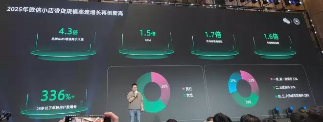 从最新披露的数据看,微信小店仍处在高速增长阶段。2025年,微信小店品牌带货GMV(商品交易总额)的增速达到平台整体的4.3倍,GPM(千次观看成交金额)同比增长1.5倍,月均动销商家数增长1.7倍;用户结构上,一线和新一线城市用户占比为32%,二三线城市占比39%。