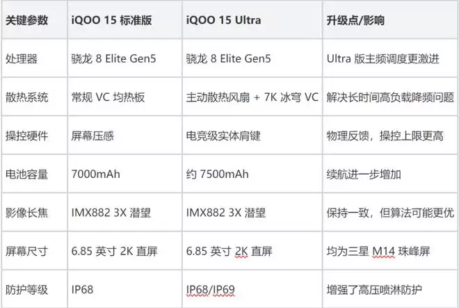 iQOO 15 Ultra vs iQOO 15 标准版 核心参数对比: