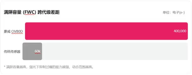 在强光环境下,普通传感器的像素很快就会被光子填满,导致照片过曝、一片死白,而LOFIC技术能让多出来的电荷流进旁边的电容里,OVB0D具备惊人的40万满阱容量(FWC),这是什么概念?这几乎是传统传感器的10倍,已经跨入了电影机摄像头的门槛。
