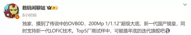 需要了解,豪威OVB0D传感器于2025年12月正式发布,它的出现直接改写了国产传感器空有像素、底子不够的历史,它不仅拥有2亿像素的超高解析力,更在传感器尺寸上逼近了1英寸的物理极限。