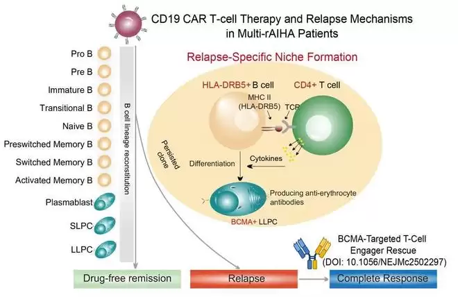 中国医学科学院血液病医院(中国医学科学院血液学研究所)主任医师施均表示,AIHA的疾病复发并非治疗失败的终点,即便在CAR-T细胞治疗后再复发,仍可基于明确的免疫学机制,实施更具针对性的细胞免疫治疗策略,为构建序贯、可持续的细胞免疫治疗新模式提供了科学依据。这一突破不仅为多线难治性患者带来福音,也为常规免疫抑制剂治疗失败的AIHA患者提供了治疗新策略。