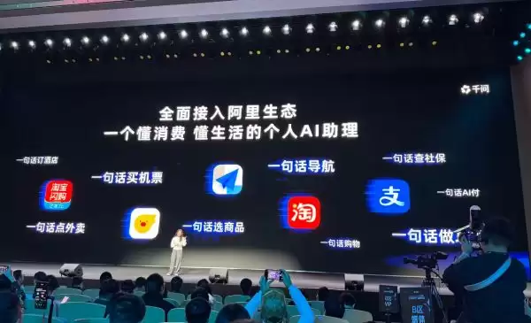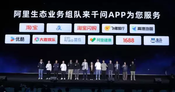 在发布会现场,我们看到,阿里将淘宝、支付宝、淘宝闪购、飞猪、高德、优酷、大麦娱乐、菜鸟、阿里健康、1688、盒马的代表请到现场,组建了千问APP任务助理背后的供应体系。