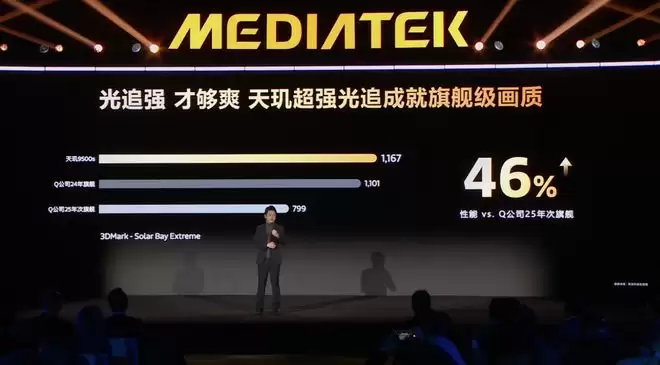 在光追方面,天玑 9500s 也拥有同级最强的光追性能,在《3DMark》的 Solar Bay 测试项目中得以达到 1167 分,比竞品高出 46%。