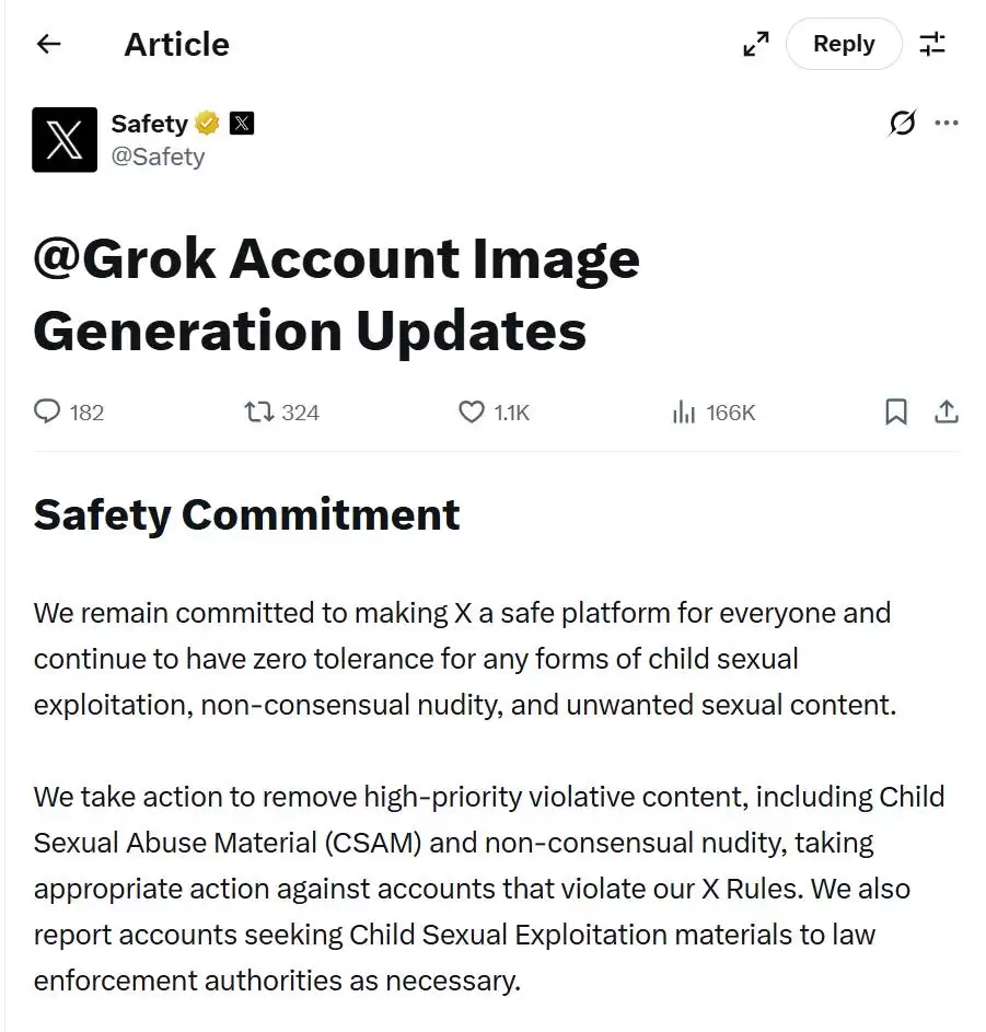 X平台安全团队在声明中表示:“我们已实施技术措施,防止Grok账号允许编辑真人穿着比基尼等暴露服装的图像。此项限制适用于所有用户,包括付费订阅者。”