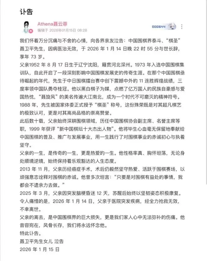 聂云菲随后发布了正式的讣告,详细说了聂卫平先生离世的时间和经过。2026年1月14日晚上22点55分,在医院因突发疾病没抢救过来。讣告里提到,先生这些年来真是没少受罪:2013年就做了癌症手术,那时候大家都以为他可能得退隐了,可他硬是撑着回到围棋场上;去年2025年3月,又因为脑梗昏迷了整整12天,醒来后还坚持康复,想着能再好起来。没想到,这次终究没挺过去。翻看聂云菲之前的帖子,去年8月她给父亲过生日时,照片里的聂卫平已经瘦了很多,但眼神里那股劲儿还在。她当时还祝福父亲“平安健康多笑笑”,现在看来,这份心愿成了永远的遗憾。