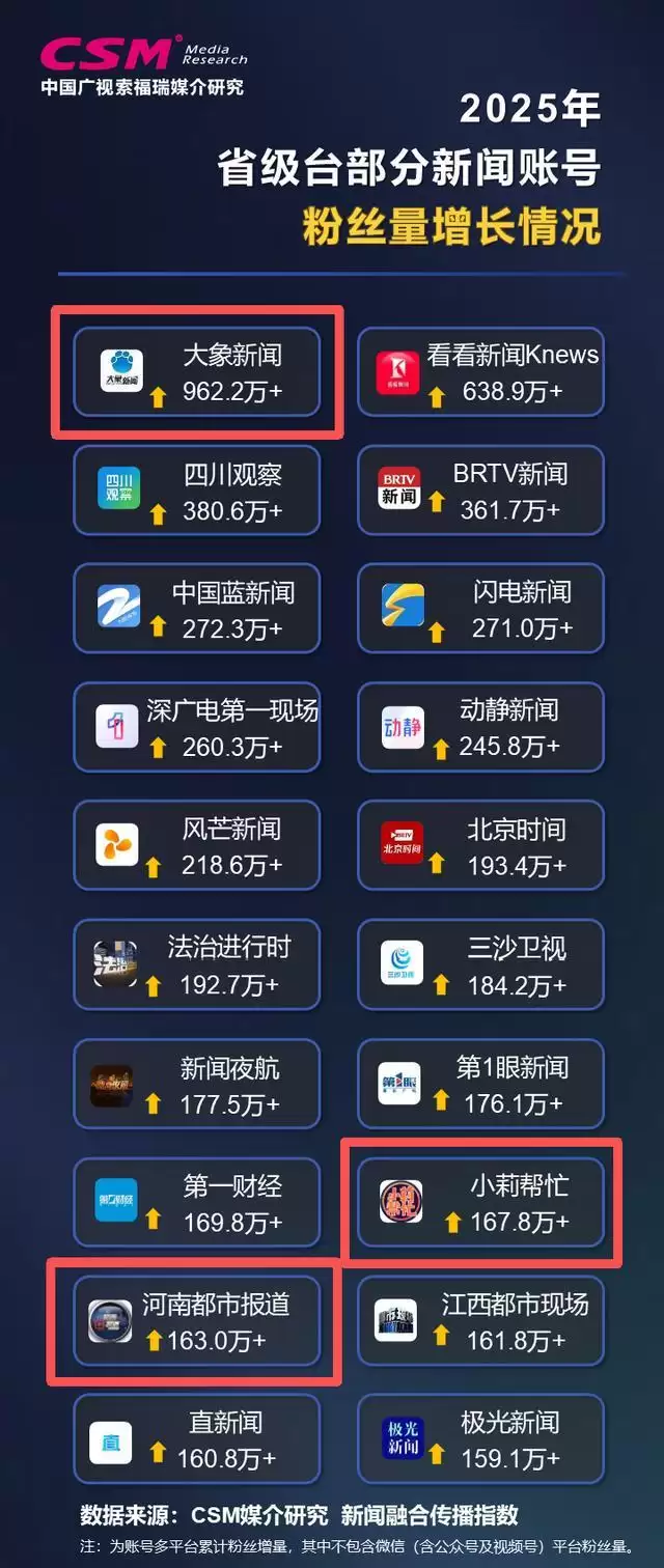 2025年,在抖音、快手、腾讯新闻、今日头条、微博、微信(含视频号、公众号)、好看视频、网易新闻等8个平台上,CSM共观察到省级台旗下活跃新闻账号超2500多个,同名合并账号855个。