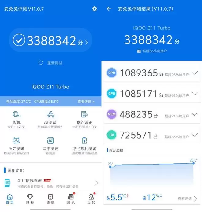 在室温22°C的环境下,随手跑了个安兔兔,分数轻松接近340万大关。