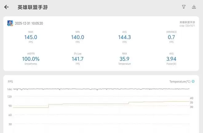 首先是大家玩得最多的《英雄联盟手游》。在开启144帧模式下,这颗芯片表现出了极佳的能效比,实测一局游戏下来,平均帧率定格在144.29帧。