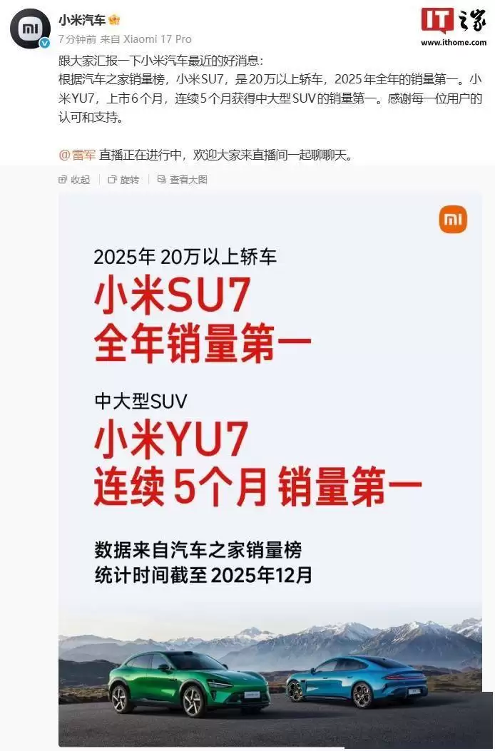 复盘小米汽车2025年:SU7销售破20万,YU7 SUV夺细分市场冠军