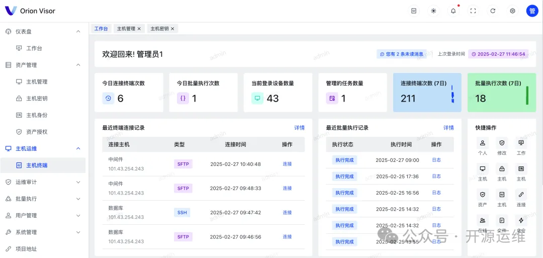 Orion-visor凭借其全面的功能特性,为运维人员提供了一个高效、便捷的工作平台。从资产管理到在线终端操作,再到文件管理和批量执行,每一项功能都旨在解决运维过程中的实际问题。无论你是刚入门的新手还是经验丰富的运维专家,Orion-visor都能成为你不可或缺的得力助手。