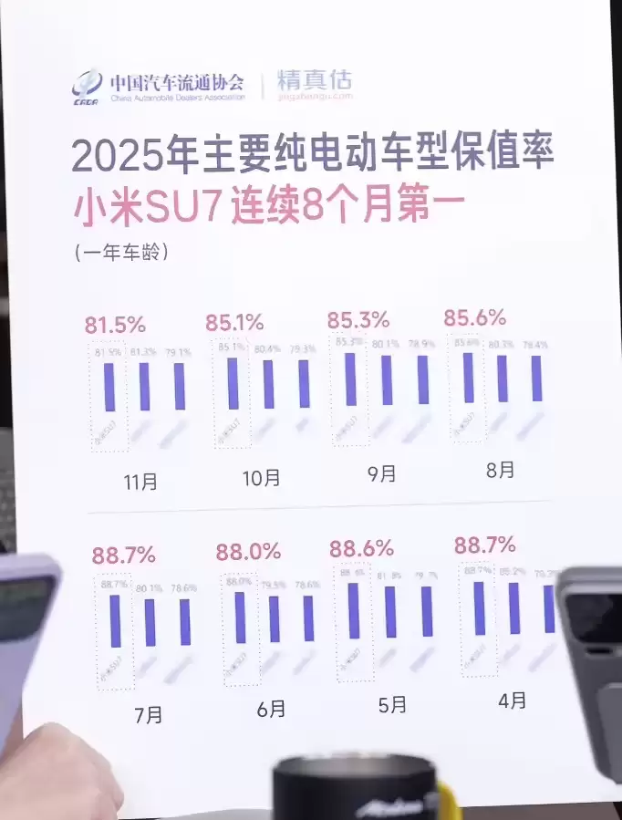 徐洁云还晒出了一份来自中国汽车流通协会的数据。数据显示,在2025年主要纯电动车型保值率排名中,小米SU7已连续8个月高居榜首(一年车龄)。
