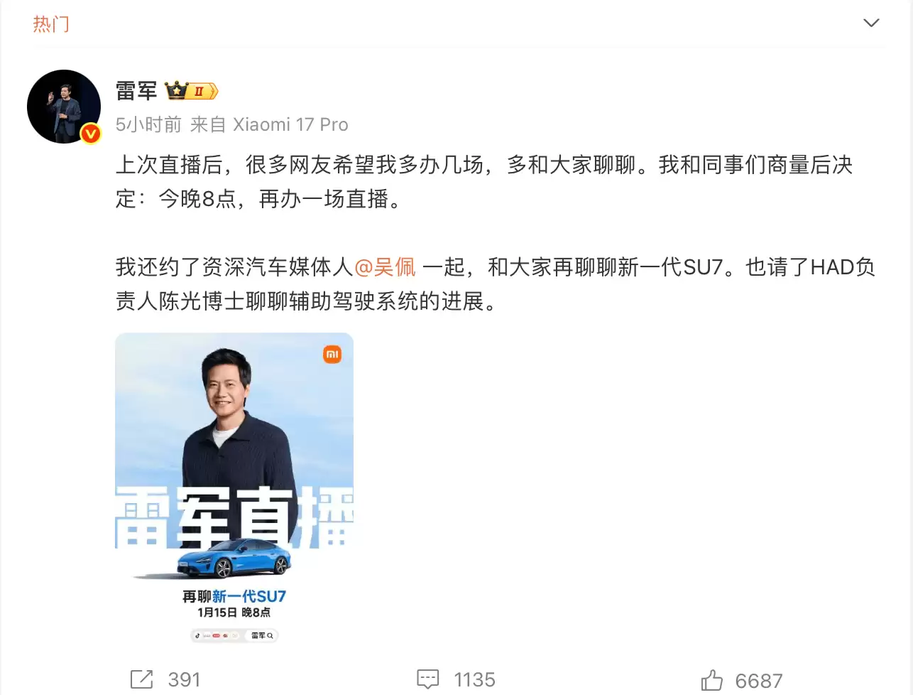 据悉,此次直播是雷军2026年以来开展的第三场公开直播。此前,他在1月3日的直播中带领工程师团队拆解小米汽车,直接回应产品质疑,峰值观看人数突破千万;1月7日的直播中,他首次详细解读新一代小米SU7,公布该车型22.99万元起的预售价及全系标配激光雷达等核心配置信息,并就涨价、营销争议等舆论热点进行了回应。