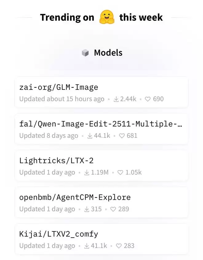 1月16日,全球知名AI开源社区Hugging Face发布消息称,一月智谱(02513.HK)联合华为开源的新一代图像生成模型GLM-Image,在开源后不到24小时便登上了Hugging Face全球趋势榜单首位。