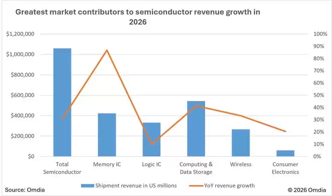 其中,存储芯片无疑是这波AI红利中最直接的受益者。分析显示,其市场规模预计在2026年将实现接近90%的显著增长。若按具体应用领域细分,计算与数据存储板块的表现将尤为亮眼,预计同年可实现41.4%的同比增幅,整体规模将突破5000亿美元;与此同时,消费电子与无线通信应用领域也将为整体增长贡献重要力量。