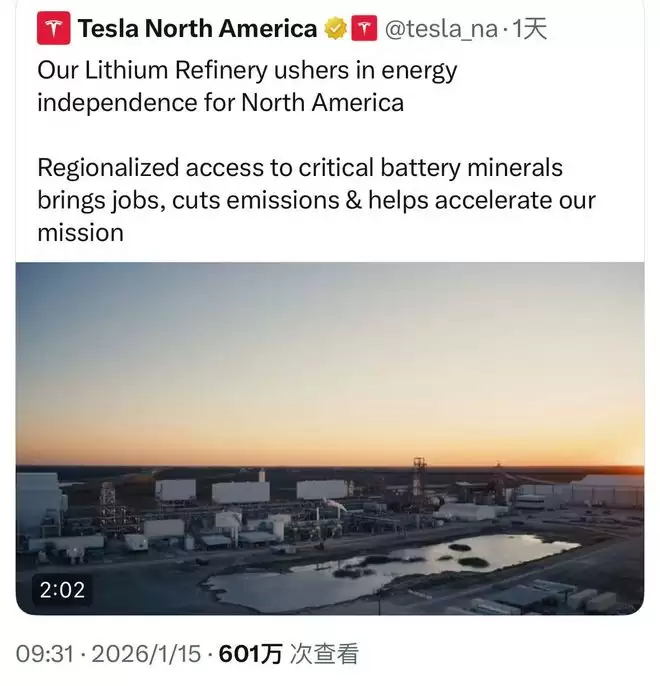 当地时间1月15日,特斯拉CEO埃隆·马斯克在社交平台X上宣布:“特斯拉已建成全球技术最先进、环保标准最高的锂精炼厂。”