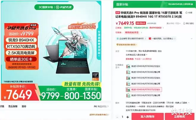 比如华硕的天选6 Pro,高端高颜值笔记本的优秀代表作,其锐龙版本开启了新一轮优惠,叠加国补后,锐龙9 8940HX处理器、RTX 5070 Laptop GPU独立显卡、16GB、1TB版本到手价只需7649元,可以说非常适合大学生入手。