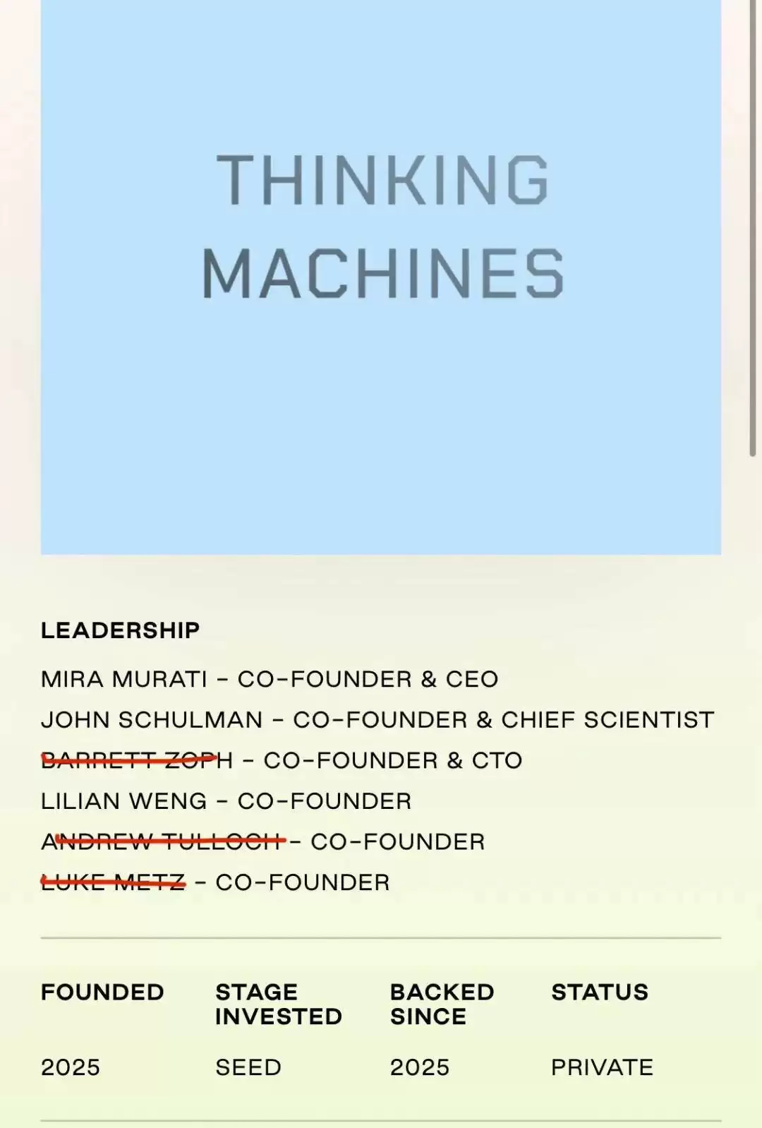 如果再加上之前离开的PyTorch大神安德鲁·塔洛克,Thinking Machines Lab目前已失去了三位联合创始人,堪称创业未半,核心团队就散了。