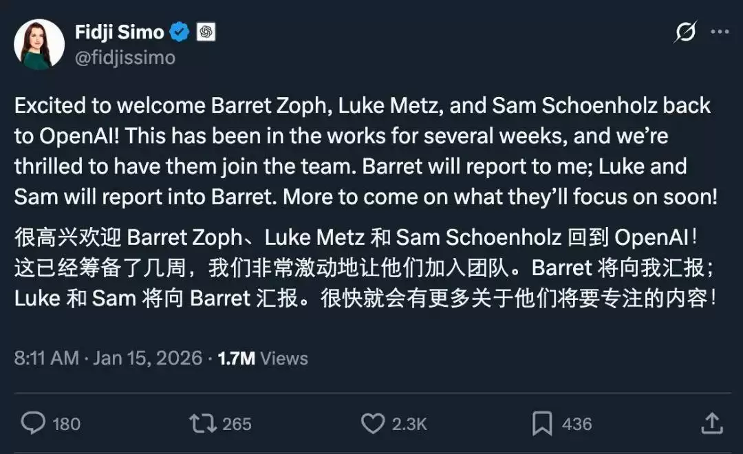 我们昨日报道了前OpenAI首席技术官米拉·穆拉蒂创立的Thinking Machines Lab出现重大人事变动的消息:联合创始人兼首席技术官巴雷特·佐普被解雇,另一位联合创始卢克·梅茨以及创始团队成员山姆·舍恩霍尔茨也一同离开,三人集体回归了OpenAI。