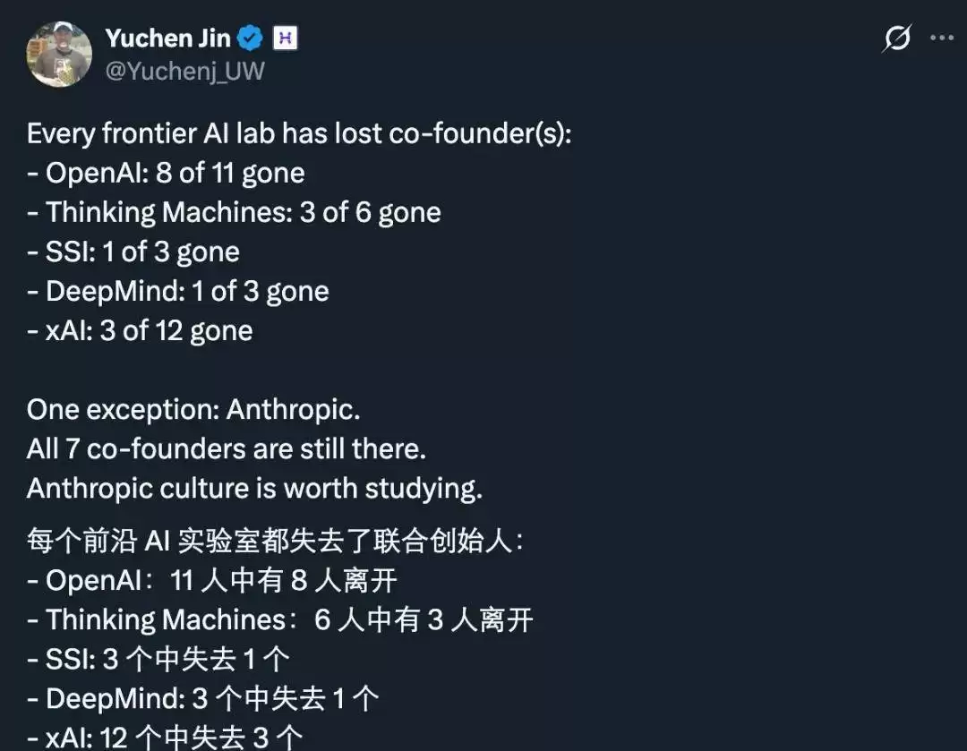 不过,在失去“联创”这件事上,Thinking Machines Lab倒也并不孤独。有人统计了最近几年头部AI公司的人员流动情况,发现联创出走比大家印象中还要频繁。