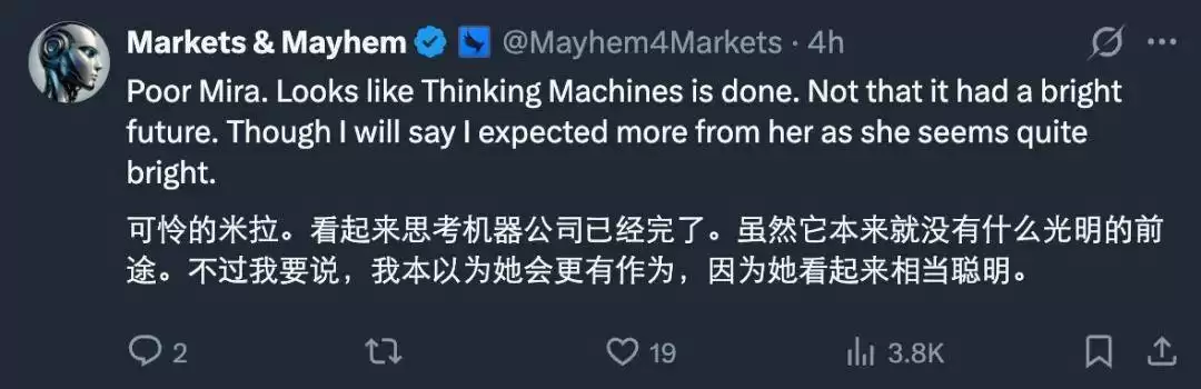 无论真相如何,这次事件都将给Thinking Machines Lab带来一些打击。甚至有悲观的网友认为,这家公司“已经完了”。